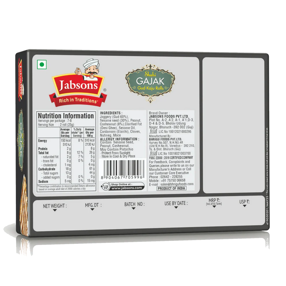 Jabsons Shahi Gajak Gud Kaju Rolls - 350 Gm (12.35